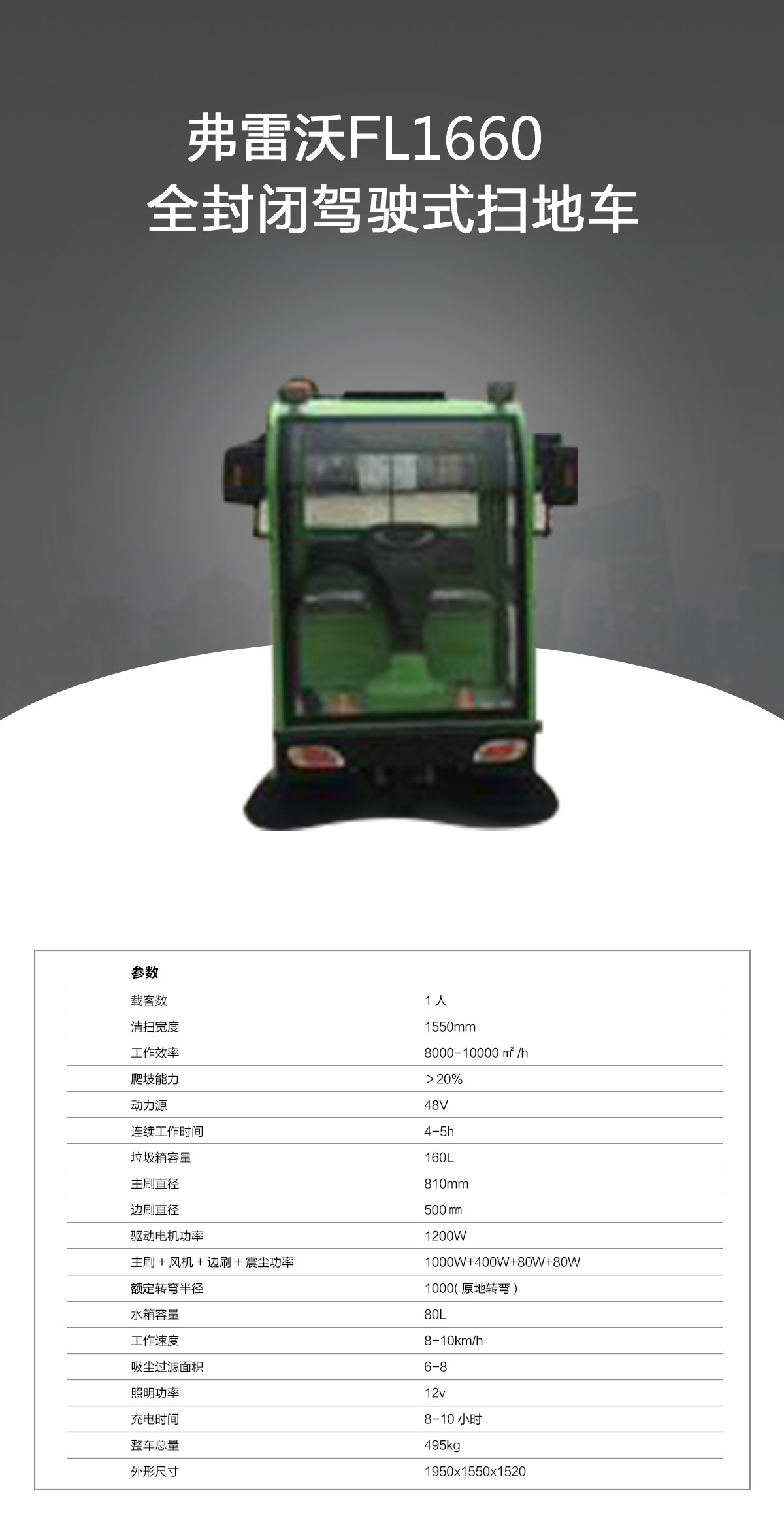 產(chǎn)品分類(lèi):駕駛式掃地機(jī)產(chǎn)品特點(diǎn):1、全封閉駕駛式掃地機(jī)1660特有出口型免維護(hù)電瓶,區(qū)別于市面上其他電動(dòng)掃地機(jī),其智能型充電機(jī)能有效延長(zhǎng)電瓶使用壽命,可使連續(xù)工作時(shí)間更長(zhǎng)。2、全封閉設(shè)計(jì)保護(hù)工作人員身心健康。3、底部主刷和兩側(cè)邊刷可自由調(diào)節(jié)高度使清掃效率更高,清掃寬度達(dá)到1550mm,完成1000㎡的地面清掃工作僅需6分鐘,比傳統(tǒng)人力清掃效率提高幾十倍,并且還能節(jié)省人力成本,省時(shí)省力、更省錢(qián)!4、控制面板友好,操作簡(jiǎn)單、易懂,使用前工作人員無(wú)需特別培訓(xùn),“保潔大媽也能輕松操作完成清掃任務(wù)”。5、配備的優(yōu)良吸塵系統(tǒng)能夠有效抑制揚(yáng)塵的產(chǎn)生,避免二次污染。適用環(huán)境:車(chē)站、機(jī)場(chǎng)、物業(yè)小區(qū)、倉(cāng)庫(kù)、車(chē)間、園區(qū)、廣場(chǎng)、學(xué)校、醫(yī)院、商場(chǎng)、公園、市政單位、街道等公共場(chǎng)所地面。